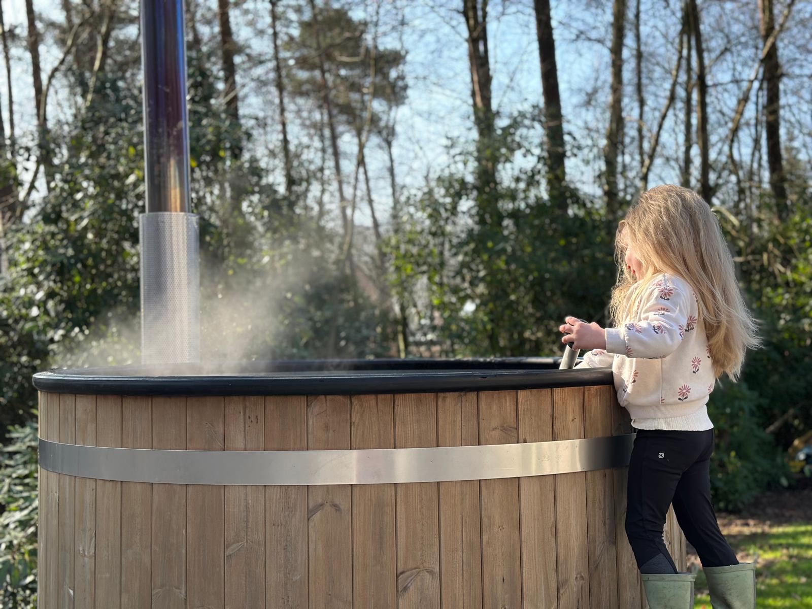 U vult het bad met kraanwater, steekt de houtkachel aan en binnen 1,5 tot 3 uur geniet u van een warm en ontspannend bad voor 5 à 6 personen.